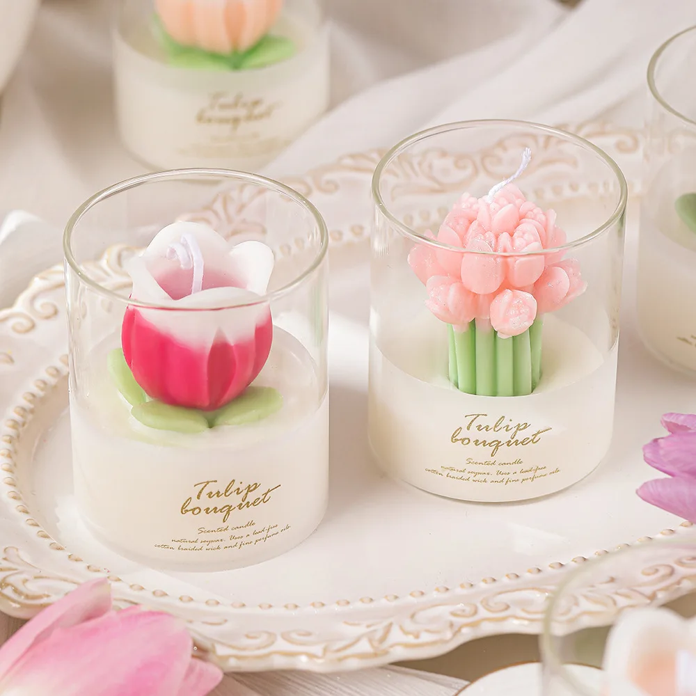 Candles for Home Scented: Made of plant essential oils and natural soy, our scented Tulip shaped candle have many benefits, such as long-lasting burning, purifying the air, creating a good atmosphere, warming your home, and more. Each hand poured soy wax candle with adorable colors, beautiful and attractive, a proper size for table, shelf, windowsill, fireplace, and other place