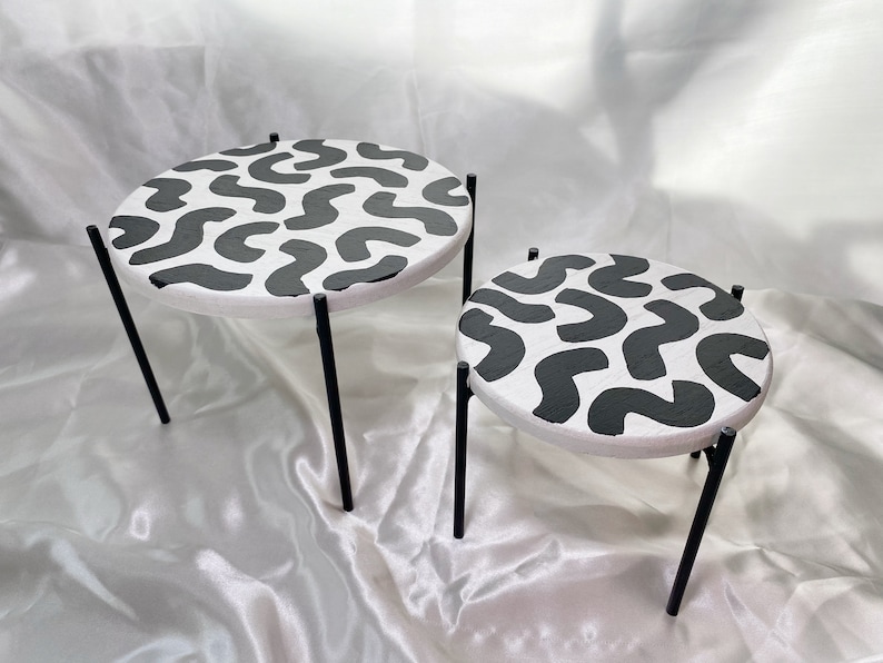 Small wooden decor table. Then it is air-dried and glazed with an acrylic finish to lock in color and seal. Sold individually or as a set. Perfect for small decor or as a plant stand to spice up your tablescape. Each piece is one of a kind. No piece is perfect and there may be small imperfections.