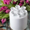 A beautiful white porcelain tulip vase with a round cylinder shaped body. Thanks to the several spouts you can always create a perfect flower arrangement. This tulip vase is part of our Delft white collection, original Delftware but in white instead of Delft blue.