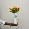 This vintage Fenton vase is a stunning addition to any collection. The hand-blown glass and hand-painted yellow melon design with herringbone pattern is a beautiful contemporary interpretation of floral themes. The vase is signed by Angie Ankrom and is an original piece from the late 20th century.